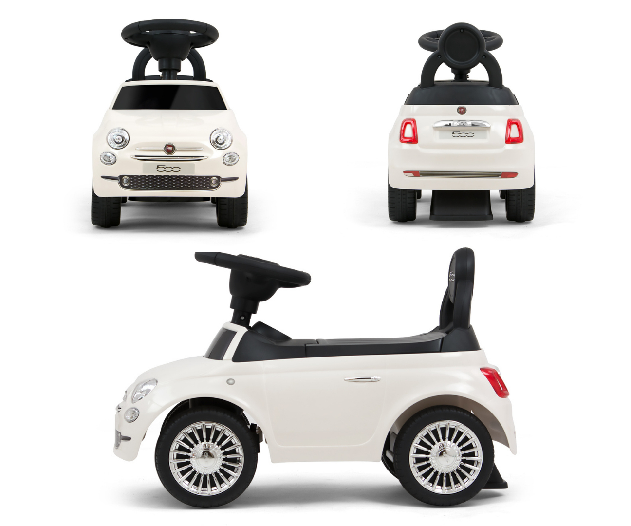 torsion front wheels three-spoke steering wheel with the Fiat logo, equipped with a music panel: a horn and cheerful melodies storage box under the seat comfortable and elegant seat with backrest seat with a pattern imitating quilted leather metal wheel axles vehicle rollover protection toy made of materials safe for children maximum load – 25 kg wheel diameter-14 cm CE safety certificate power supply: 2 AA batteries (not included) available in 4 colors (pink, white, red, blue) age range 12-36 months